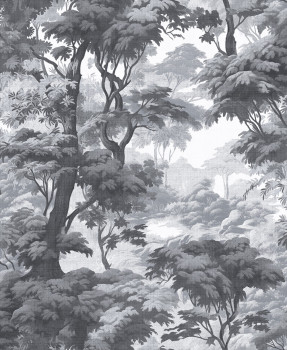 Vliestapete mit Motiv Wald, Bäume in Grau- und Schwarztönen, mit Stofftextur-Effekt.