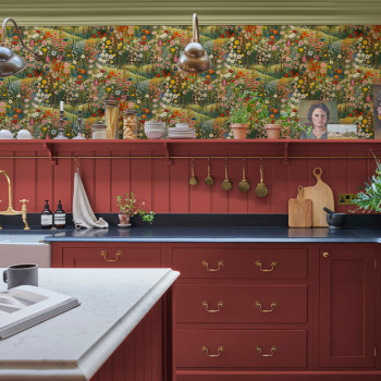 Vliestapete mit Motiv blühender Wiese in Grün-, Rot-, Blau-, Rosa- und Gelbtönen.