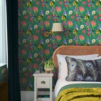 Vliestapete mit grünem Hintergrund und Motiv blühender Passionsblumen-Zweige.