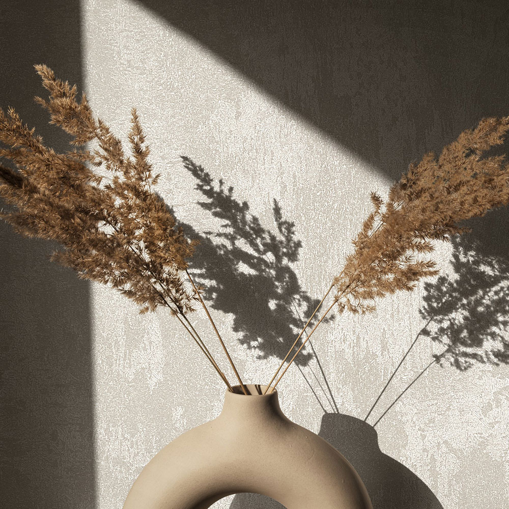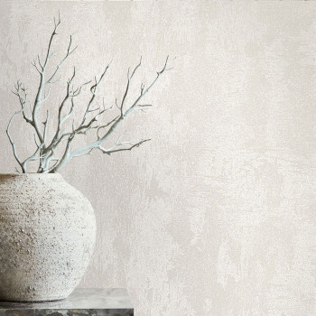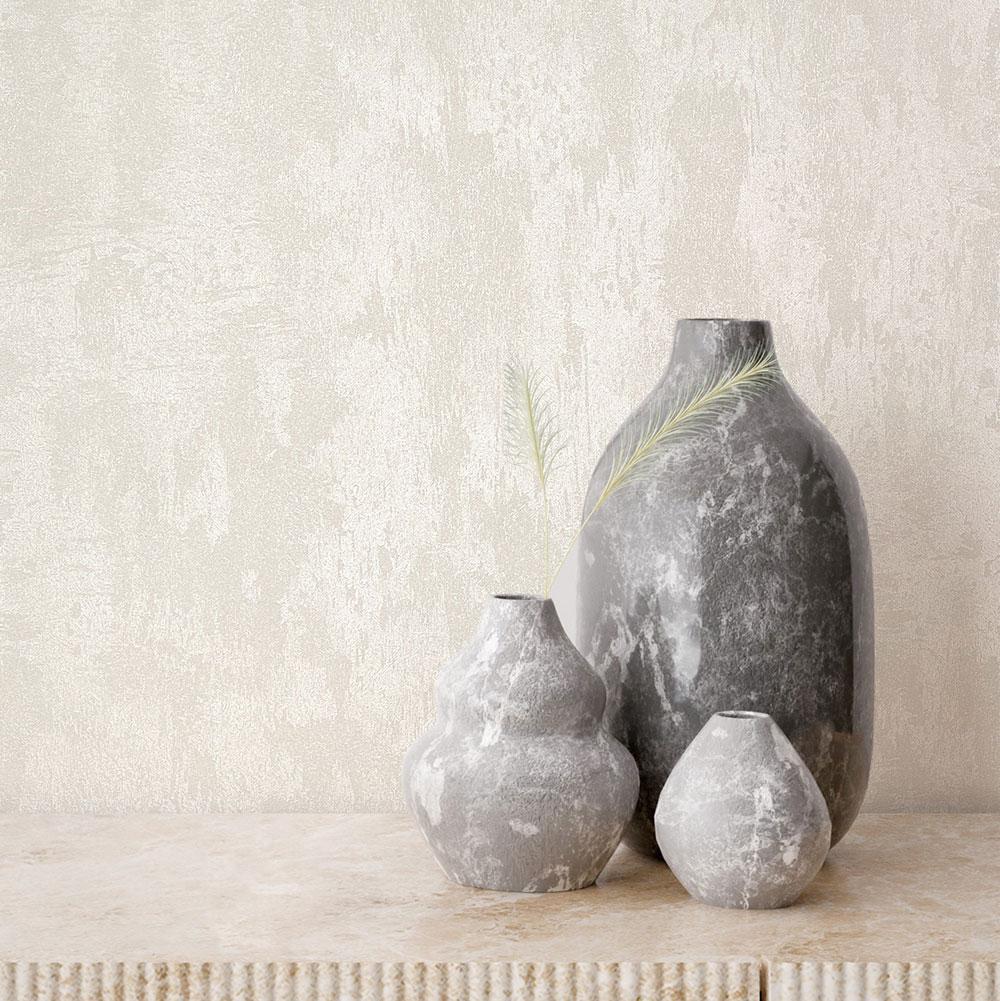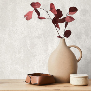 Vliestapete mit Vinyloberfläche, Dekor einer weißen Putzoptik, matt und mit leichtem Glanz, feine Struktur.