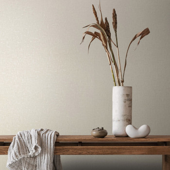 Vliestapete mit Vinyloberfläche, Stoffoptik in Beigetönen, teilweise mit metallischen Akzenten.