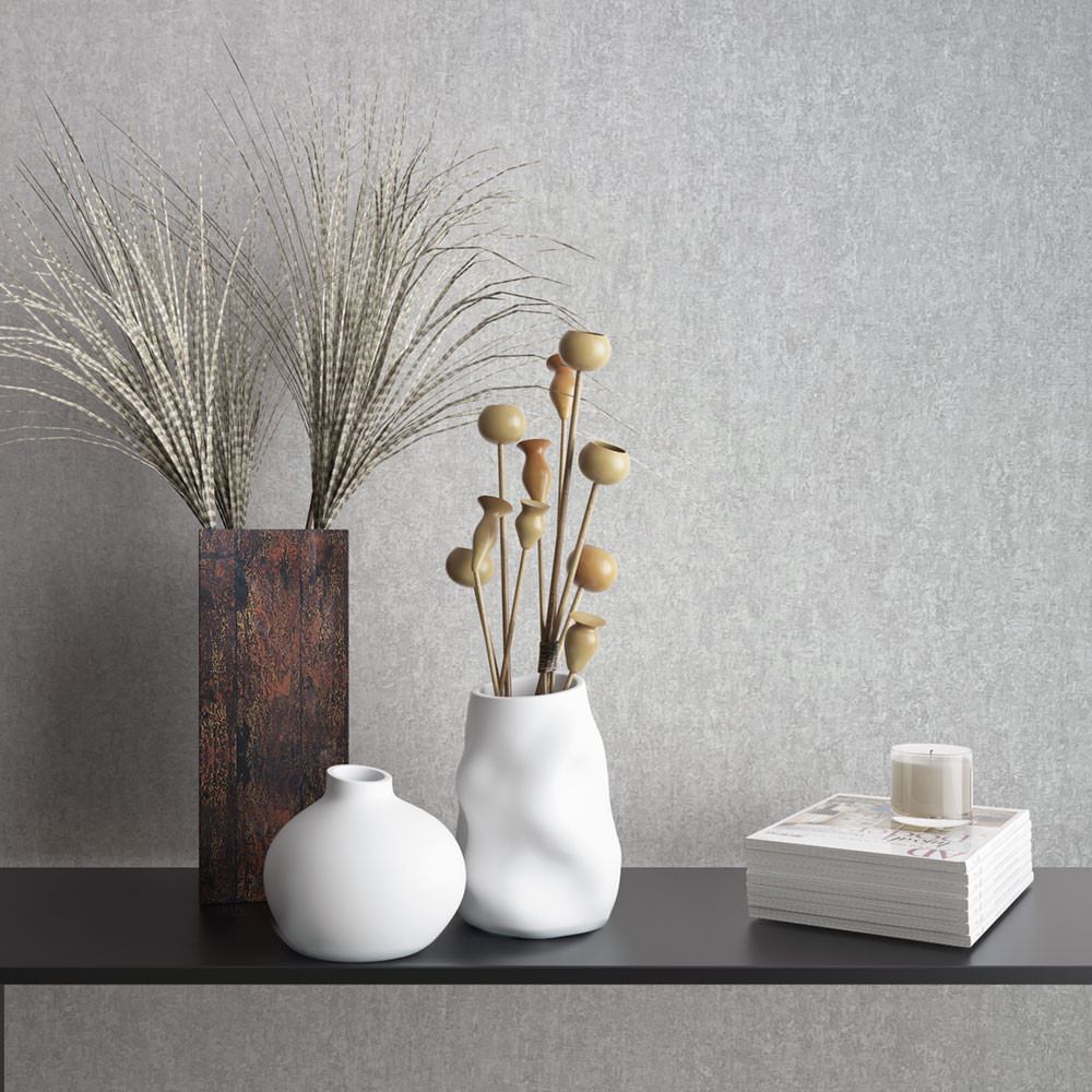 Vliestapete mit Vinyloberfläche, Dekor in Grau mit Putzoptik, feine Struktur.