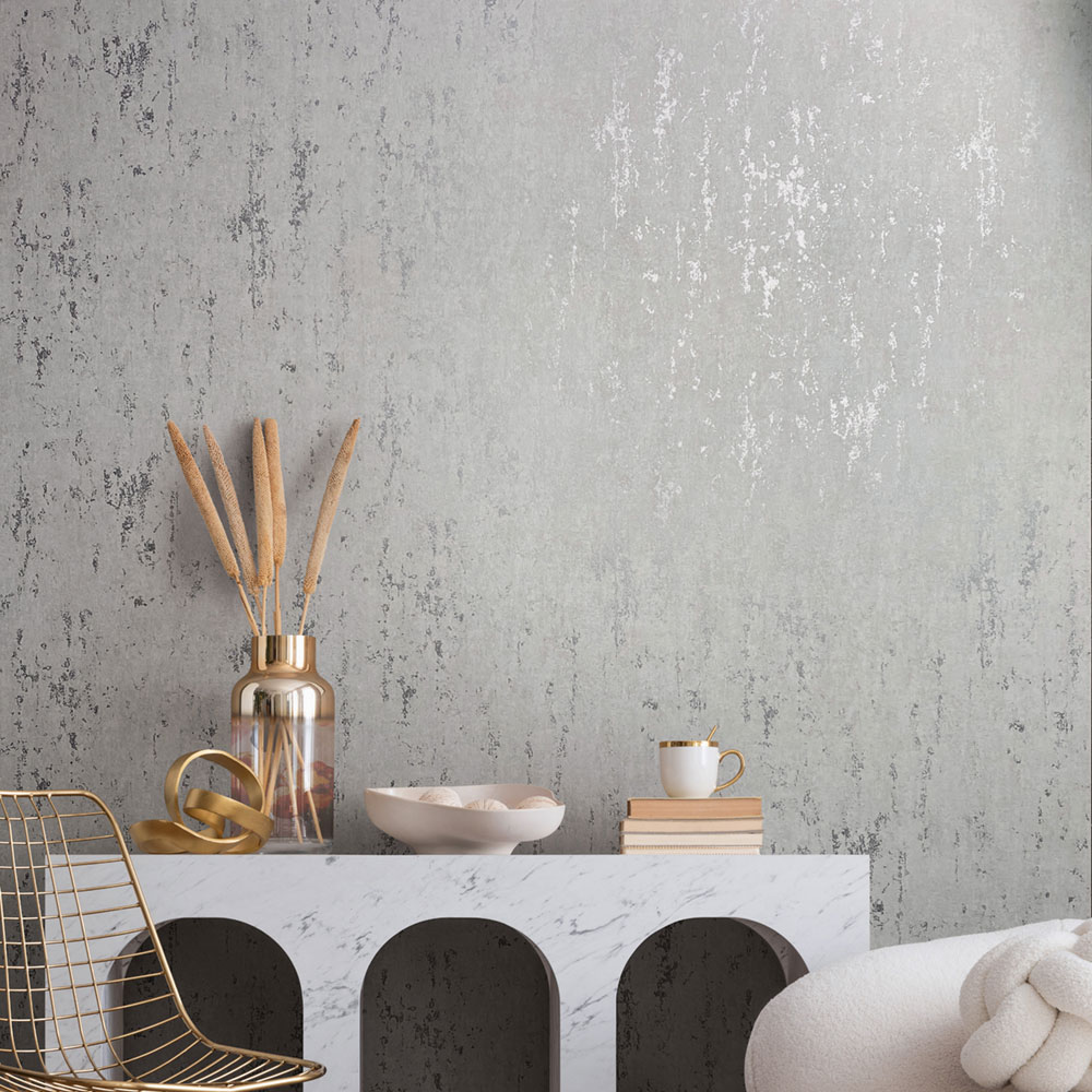 Vliestapete mit Vinyloberfläche, Dekor in Grau mit Putzoptik und silbernen Metallic-Flächen, feine Struktur.