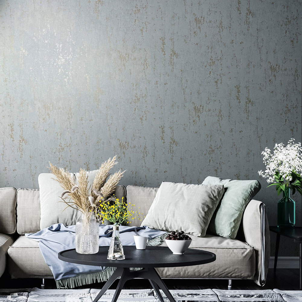 Vliestapete mit Vinyloberfläche, Dekor in Türkis mit halbglänzenden gold-beigen metallischen Prägungen, feine Struktur.