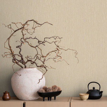 Vliestapete mit Vinyloberfläche, vertikale Struktur, die Holzoptik in Beigetönen nachbildet.