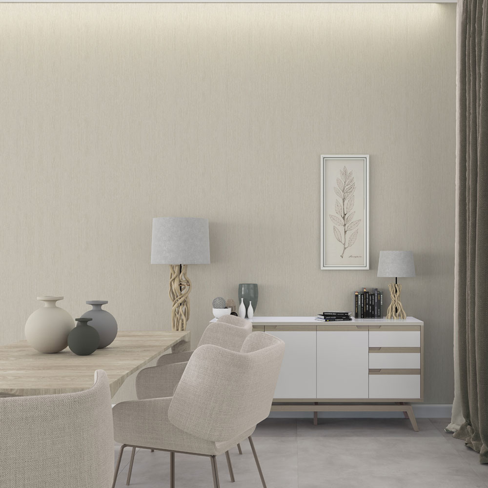 Vliestapete mit Vinyloberfläche, vertikale Struktur, die Holzoptik in Cremetönen nachbildet.
