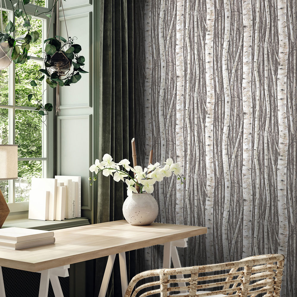 Vliestapete mit Vinyloberfläche, gestreifte Struktur, Baummotiv mit Birkenhain in Grau-Braun-Tönen.