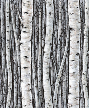 Vliestapete mit Vinyloberfläche, gestreifte Struktur, Baummotiv mit Birkenhain in Grau-Blau-Tönen.