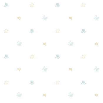 Papier, weiße Kindertapete mit Pfotenabdrücken in Blaugrün- und Beigetönen.