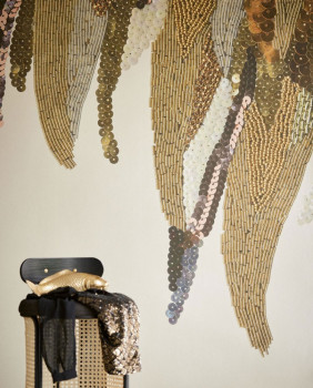 Fototapete mit weißem, halbglänzendem Hintergrund, mit imitierten Perlen und Pailletten.