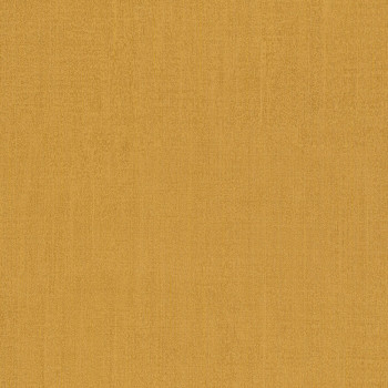 Senffarbene Vliestapete mit Vinyloberfläche. Feine Streifenstruktur, unregelmäßige Goldpunkte.