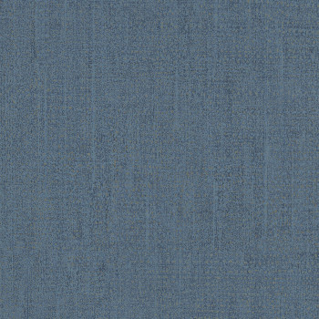 Blaue Vliestapete mit Vinyloberfläche. Feine Streifenstruktur, unregelmäßige Goldpunkte.