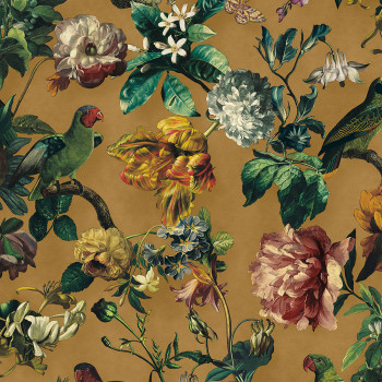 Mehrfarbige Luxustapete mit Papageien und Blumen, inspiriert von den Gemälden niederländischer Maler des Goldenen Zeitalters.