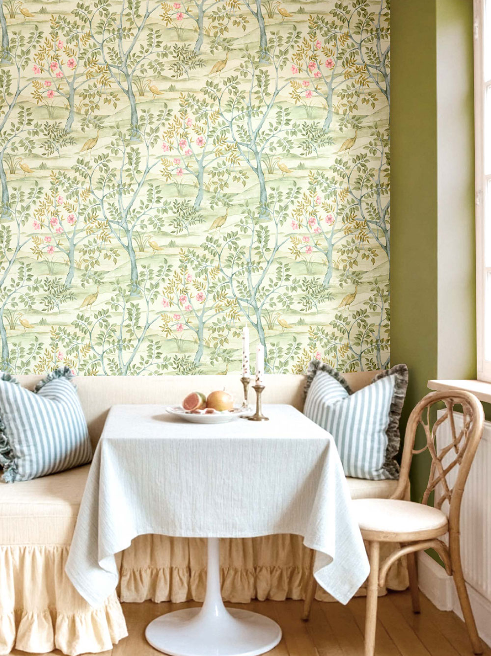 Luxuriöse Vliestapete mit Vinyloberfläche, Motiv aus Bäumen und Reihern in Grün-, Blau- und Rosatönen, Stoffstruktur.