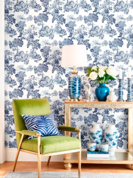 Luxuriöse Vliestapete mit Vinyloberfläche, romantisches Motiv, inspiriert von historischen Toile-de-Jouy-Stoffen, weißer Hintergrund, Blautöne, Stoffstruktur.