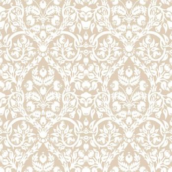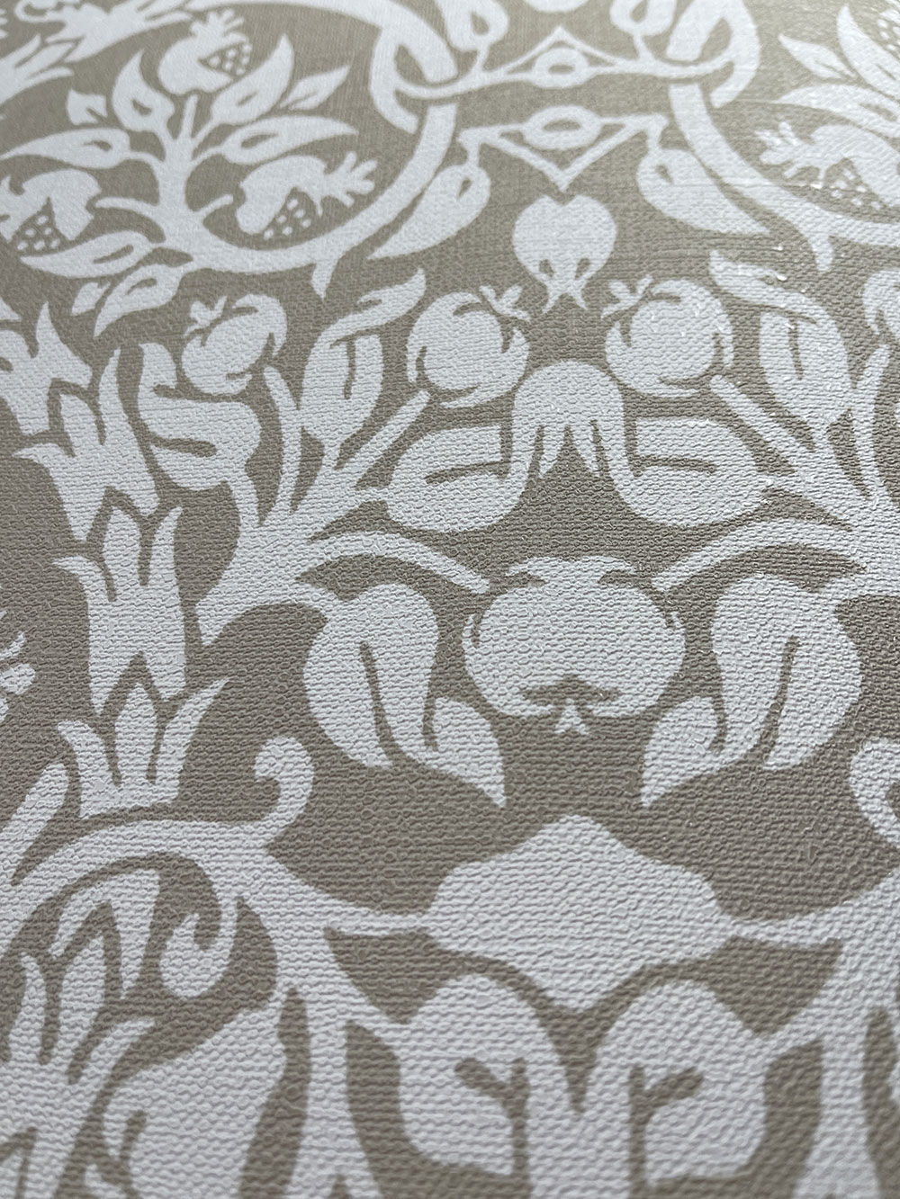 Luxuriöse Vliestapete mit Vinyloberfläche, natürliches Ornamentmuster, Stoffstruktur, Weiß- und Beigetöne.