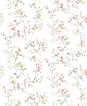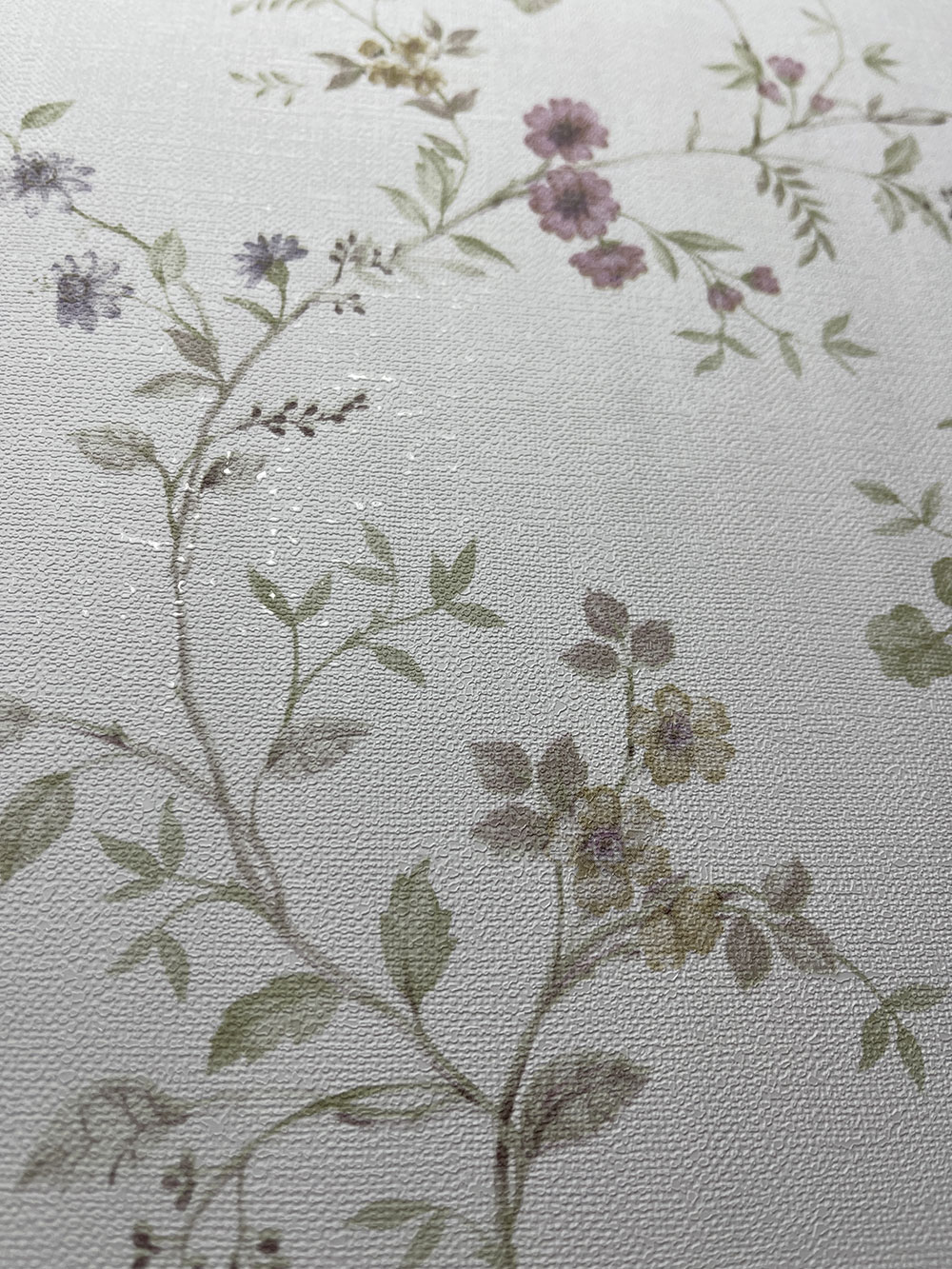 Luxuriöse Vliestapete mit Vinyloberfläche, Blumenmotiv, Stoffstruktur, in den Farbtönen Beige, Grün, Rosa, Lila und Ocker.