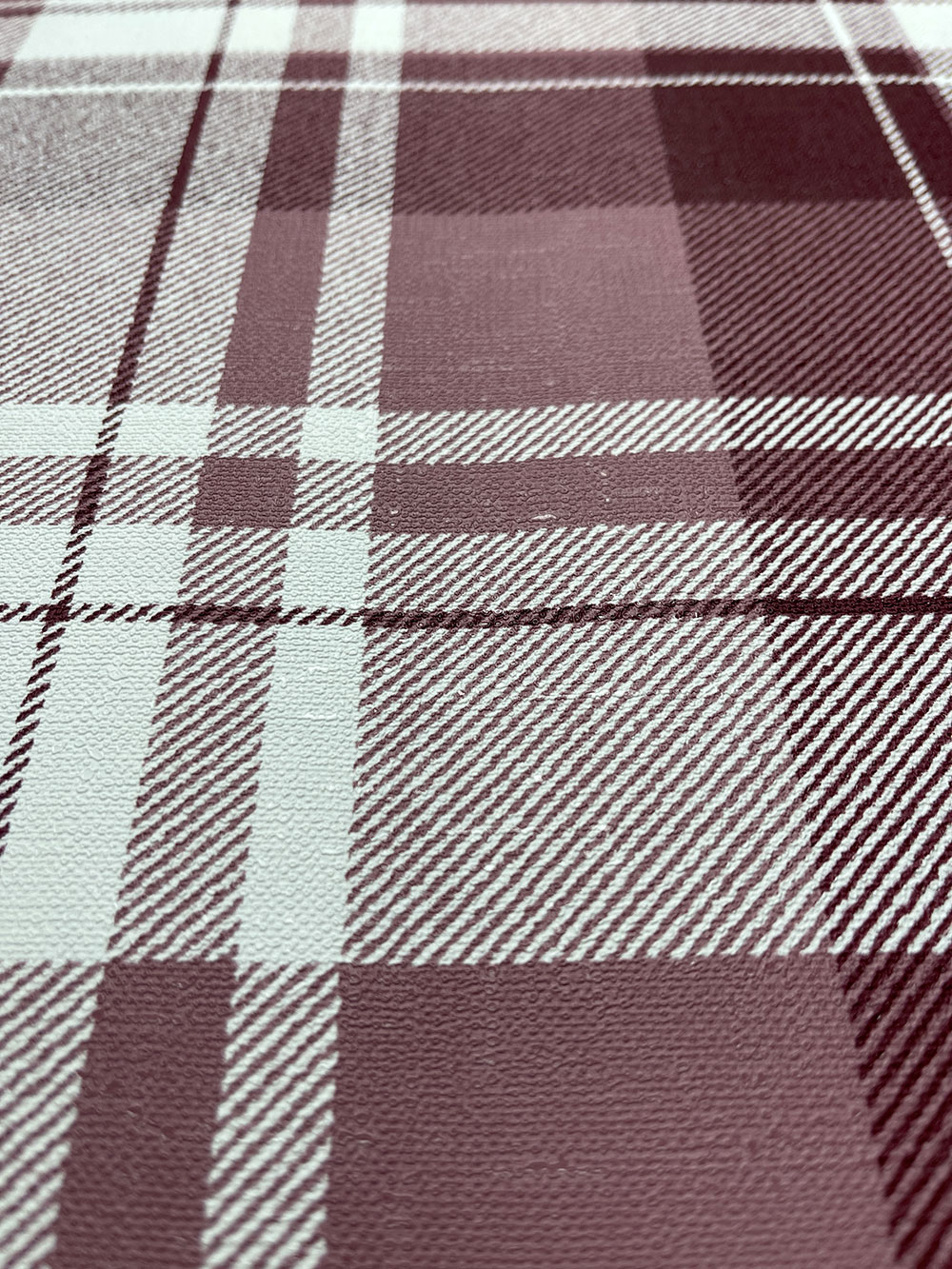 Luxuriöse Vliestapete mit Vinyloberfläche, Stoffstruktur; das Muster erinnert an einen Tartanstoff in Rottönen.