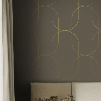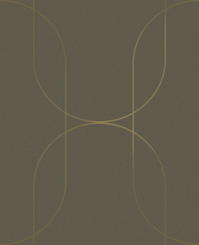 Vliestapete, matt, feinfaserige Struktur, Farbe: Braun, halbglänzende goldene Linien.
