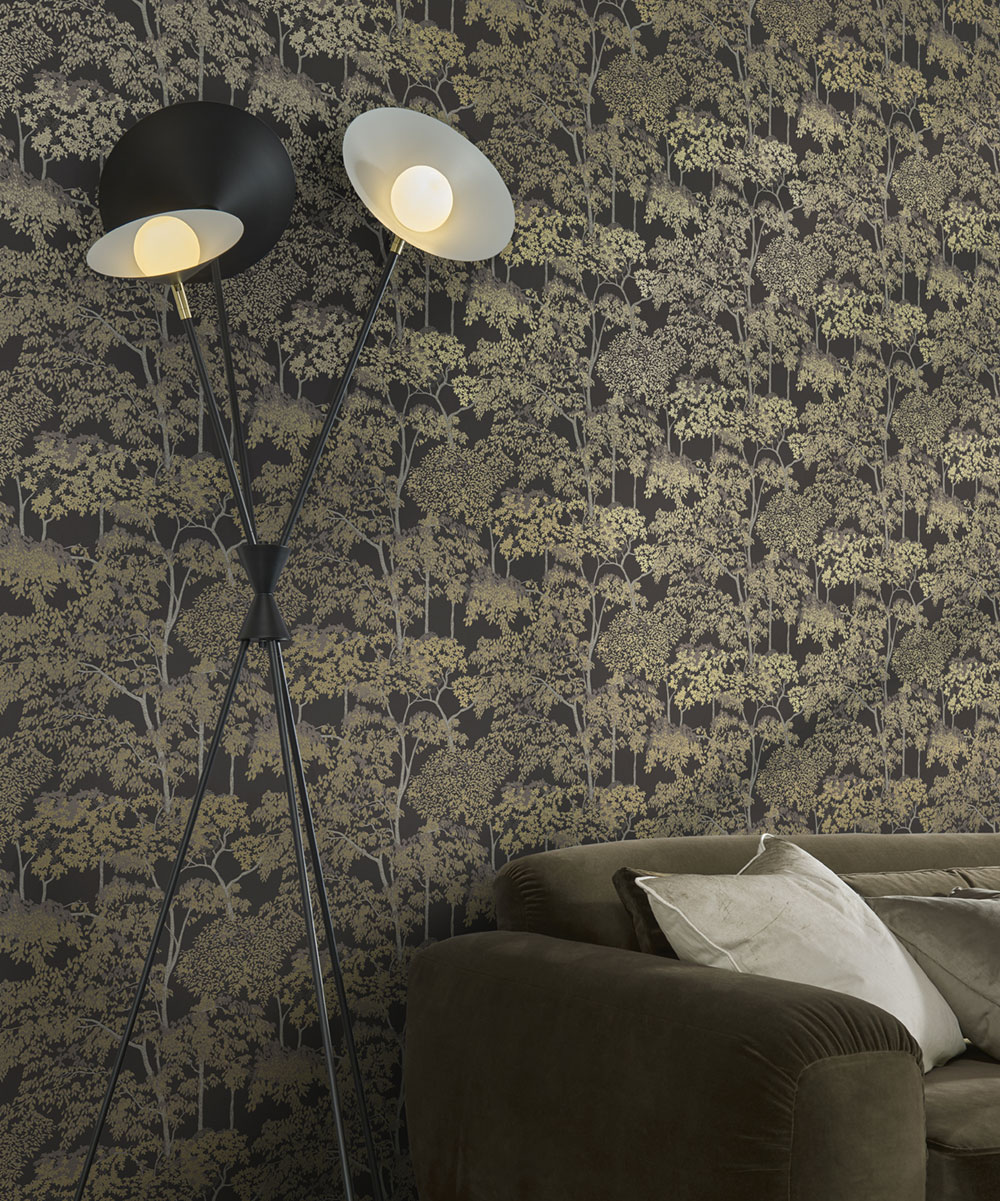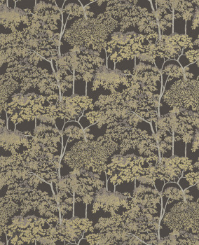 Vliestapete, mattes dunkelbraunes Hintergrundmuster, Bäume mit seidenmatten goldenen Blättern und grau-silbernen Stämmen.