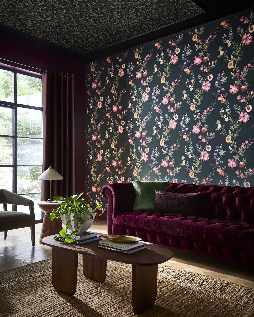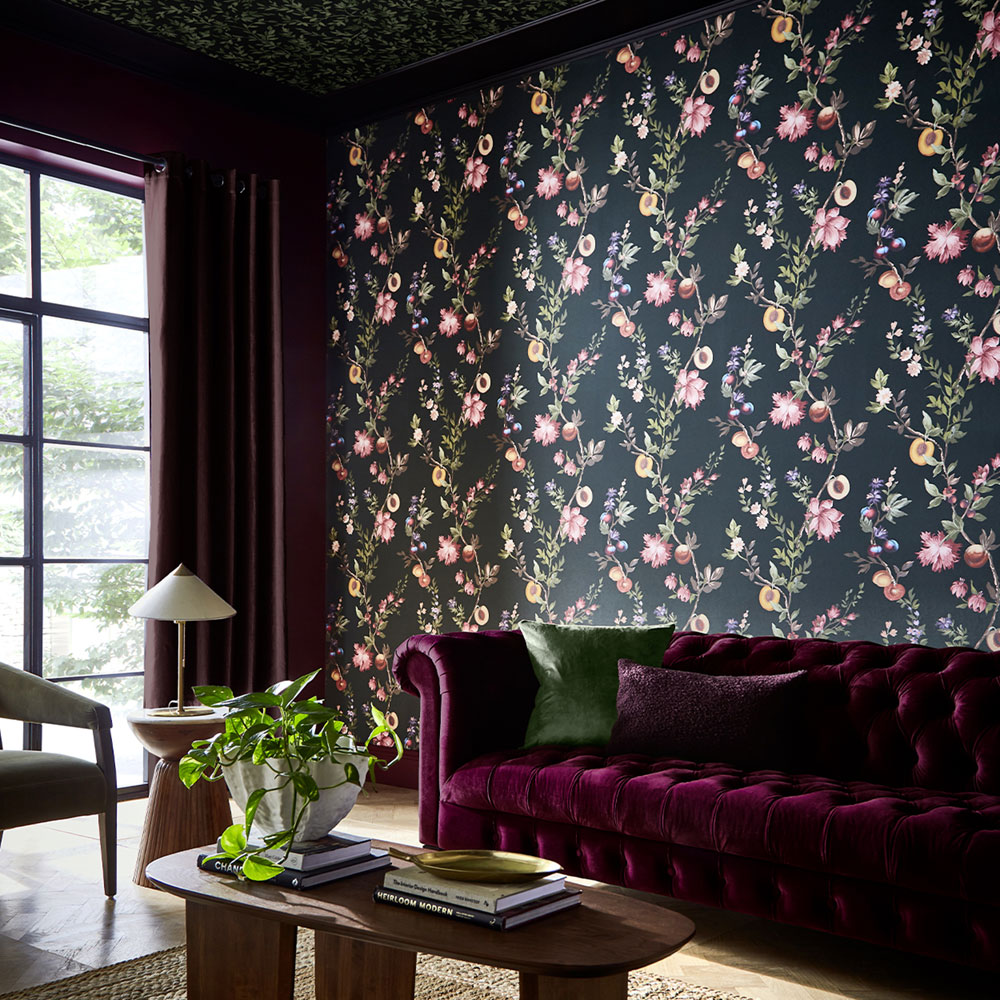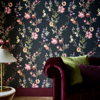 Hier finden Sie ausdrucksstarke florale Muster, von kleinen Blüten auf dunklem Hintergrund, die mutig, elegant und leicht verführerisch wirken, bis hin zu sanfteren Varianten auf hellem Untergrund. Ein wunderschönes Detail sind die Zweige von Pfirsichbäumen und anderen Obstbäumen, reich an Blüten und Früchten, die den Tapeten Natürlichkeit, Frische und eine romantische Atmosphäre verleihen.