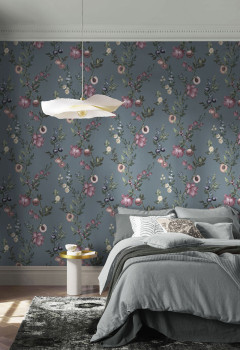 Vliestapete, blauer Hintergrund, Zweige mit Blumen und Früchten.