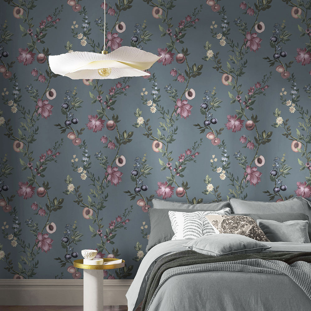 Hier finden Sie ausdrucksstarke florale Muster, von kleinen Blüten auf dunklem Hintergrund, die mutig, elegant und leicht verführerisch wirken, bis hin zu sanfteren Varianten auf hellem Untergrund. Ein wunderschönes Detail sind die Zweige von Pfirsichbäumen und anderen Obstbäumen, reich an Blüten und Früchten, die den Tapeten Natürlichkeit, Frische und eine romantische Atmosphäre verleihen.