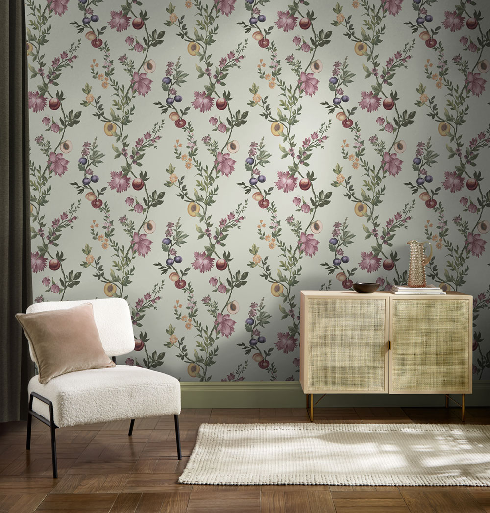 Vliestapete, hellgrüner Hintergrund, Zweige mit Blumen und Früchten in Rosa- und Violetttönen.