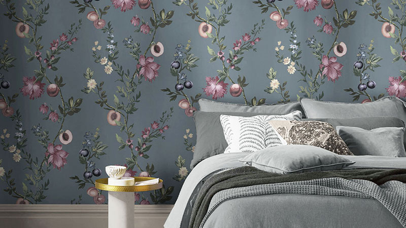 Hier finden Sie ausdrucksstarke florale Muster, von kleinen Blüten auf dunklem Hintergrund, die mutig, elegant und leicht verführerisch wirken, bis hin zu sanfteren Varianten auf hellem Untergrund. Ein wunderschönes Detail sind die Zweige von Pfirsichbäumen und anderen Obstbäumen, reich an Blüten und Früchten, die den Tapeten Natürlichkeit, Frische und eine romantische Atmosphäre verleihen.