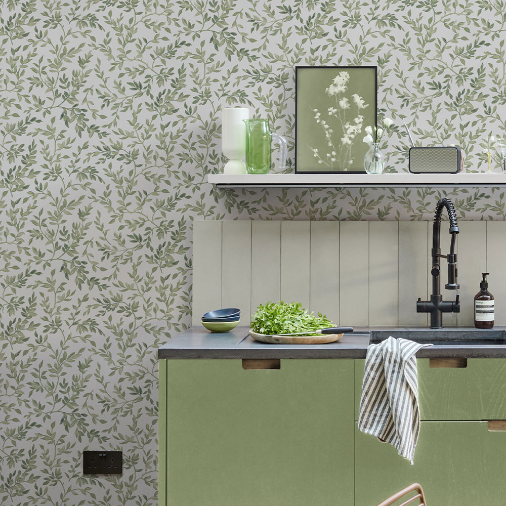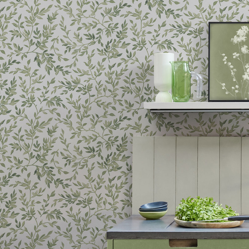 Vliestapete, weißer Hintergrund, Motiv aus Zweigen mit Blättern in verschiedenen Grüntönen.