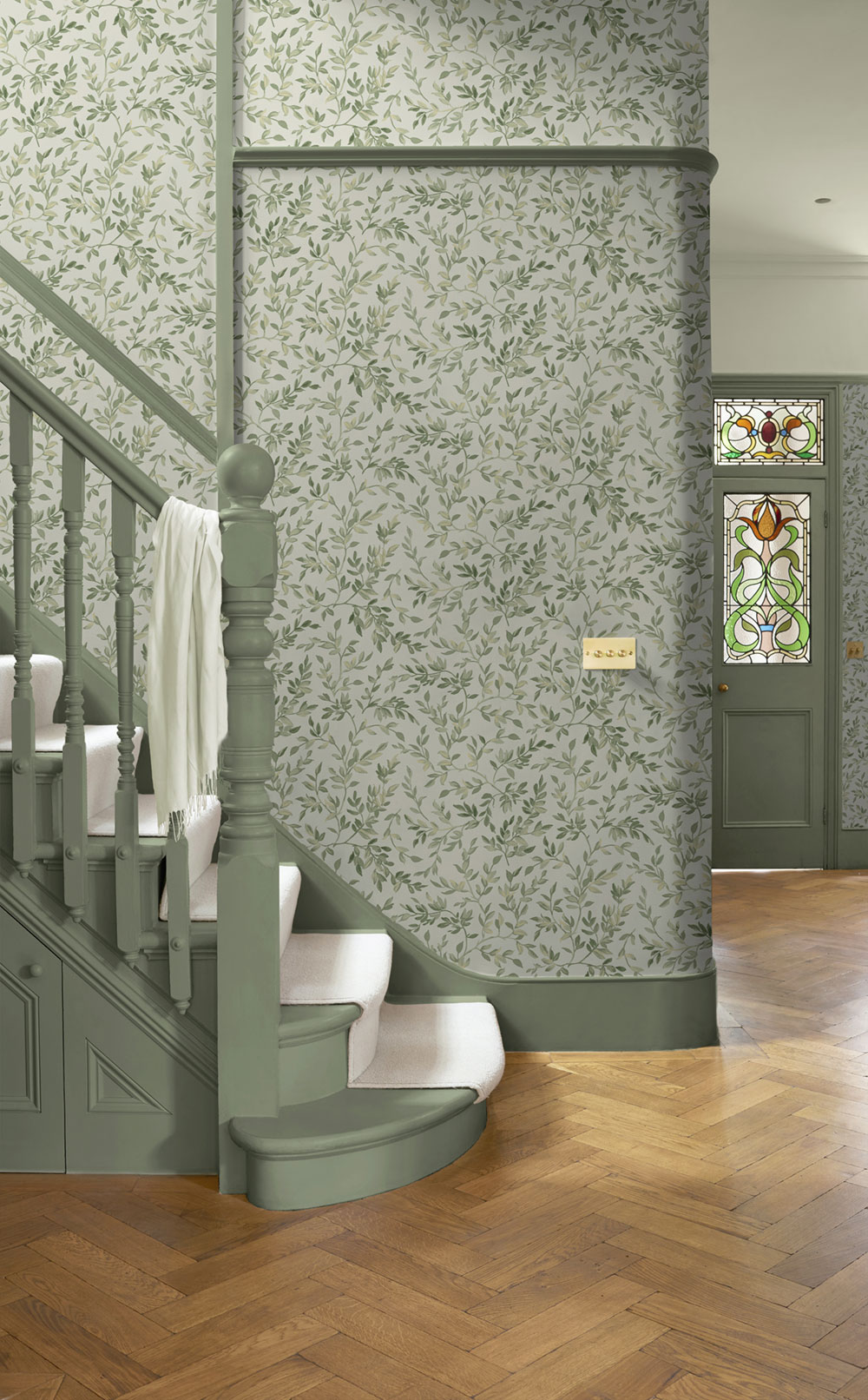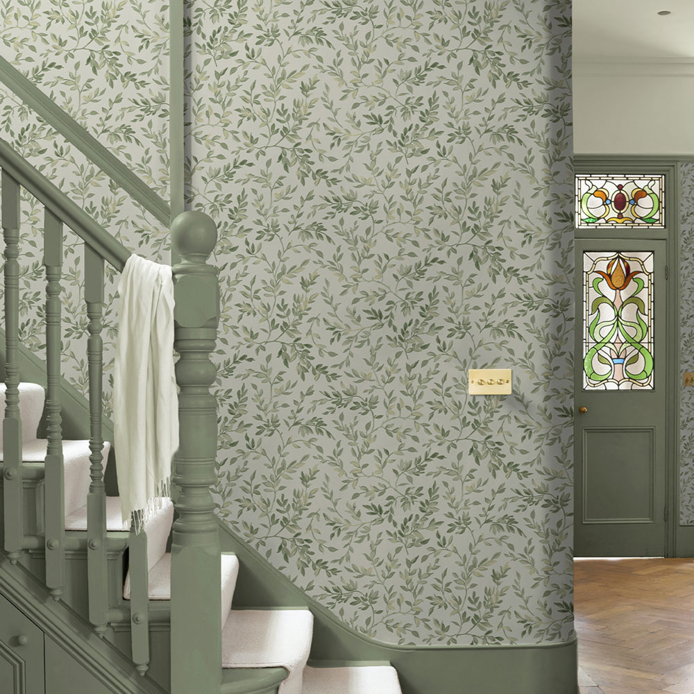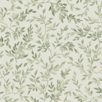 Vliestapete, Motiv aus Zweigen mit Blättern, in verschiedenen Grüntönen.