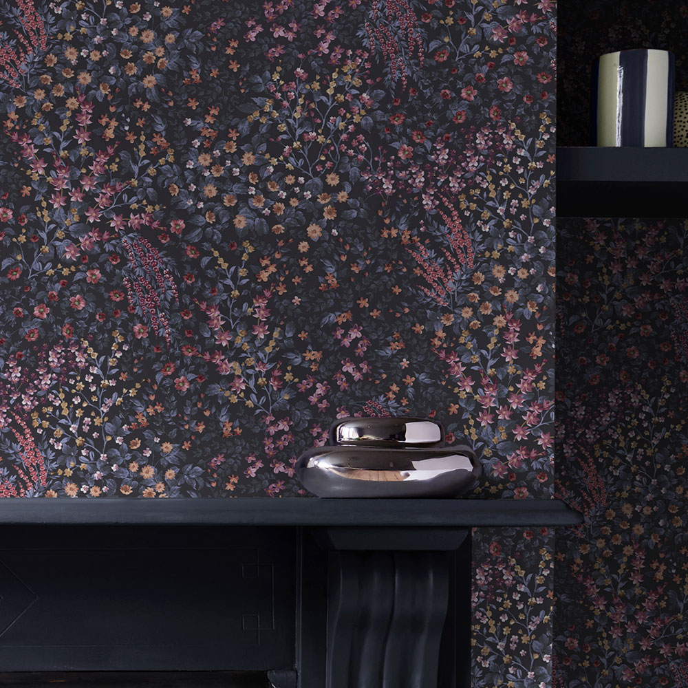 Vliestapete, dunkelblauer Hintergrund, Blumenmuster in Blau- und Rosatönen.