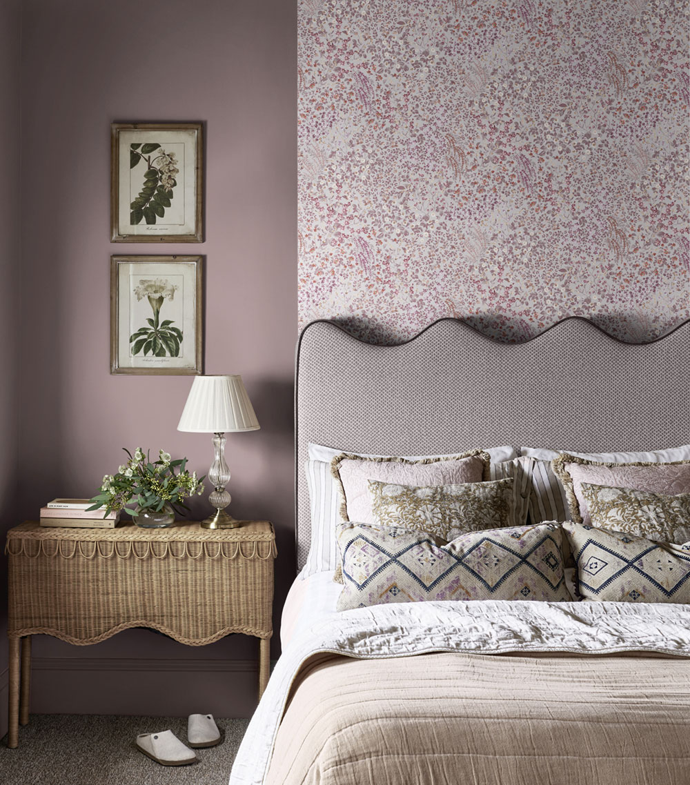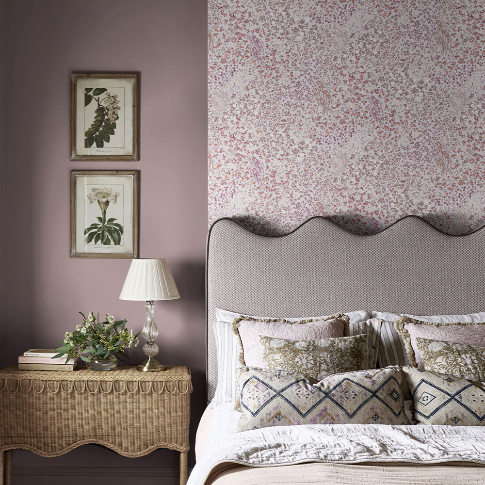 Vliestapete, rosa Hintergrund, Blumenmuster in Rosa-, Rot- und Lilatönen.