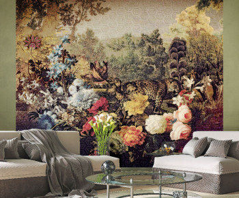 Luxuriöse Vlies-Motivtapete mit Vinyloberfläche, Blumen und Bäumen, Hintergrund in Braun-, Beige- und Schwarztönen sowie Violett, Bäume in Braun, Grün und Gelb, Blumen in Rot, Weiß, Gelb, Blau und Rosa, Gepard in Braun, Schwarz und Gelb.