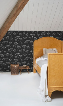 Schwarze Vliestapete mit weißem Pflanzenmotiv.