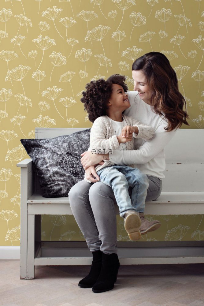 Vliestapete in Senffarbe und weißem Pflanzenmotiv.