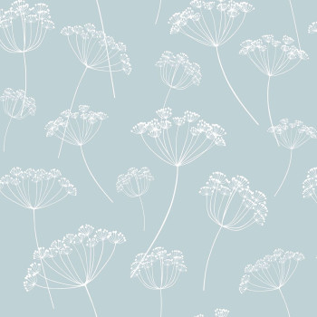 Azurblaue Vliestapete mit weißem Pflanzenmotiv.
