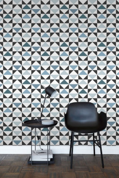 Weiße geometrische Vliestapete mit schwarz-blauem Muster.