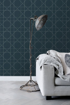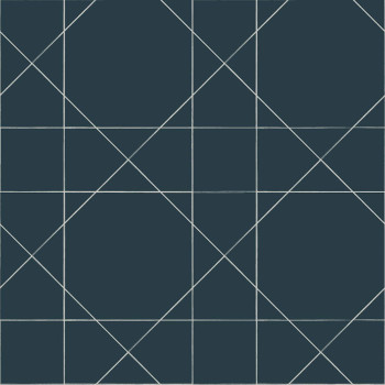 Dunkelblaue Vliestapete mit weißem geometrischem Muster.
