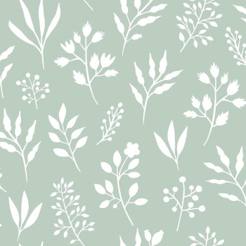 Vliestapete im Scandi-Stil - weißes Pflanzenmuster auf hellgrünem Hintergrund.