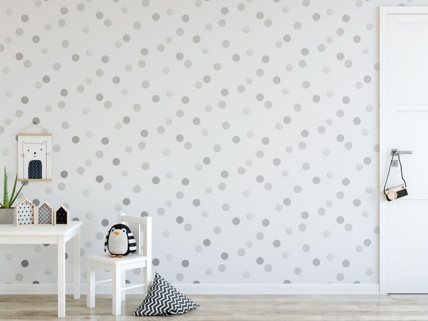 Weiße Tapete mit rosa Tupfen.