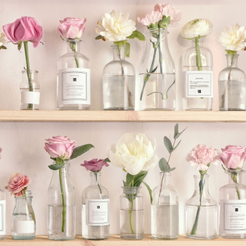 Tapete mit Blumen in Regalen.