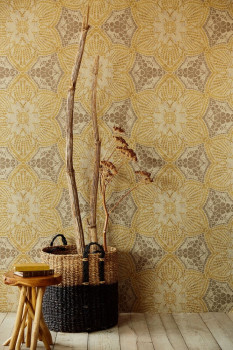 Vlies grau-silberne Fototapete mit ockergoldenen Blumen.
