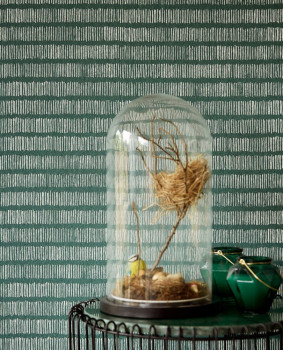Grüne Vliestapete mit geometrischem Muster und silbrigem Glanz.