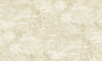 Vliestapete mit Vinylbeschichtung, Palmenmotiven, Beigetönen und Stoffstruktur.