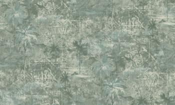 Vliestapete mit Vinylbeschichtung, Palmenmotiven, Grüntönen und Stoffstruktur.