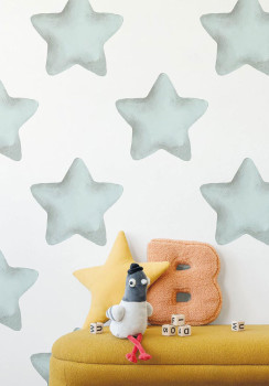 Vliestapete für die Wand, mit feiner Struktur, weißer Hintergrund, blaue Sterne mit einem Durchmesser von 30 cm.