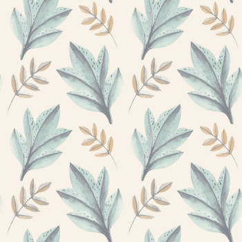 Glatte Vliestapete, weißer Hintergrund, größere blaue Blätter mit einer Länge von 20 cm, kleinere grau-goldene Blätter mit einer Länge von 15 cm.