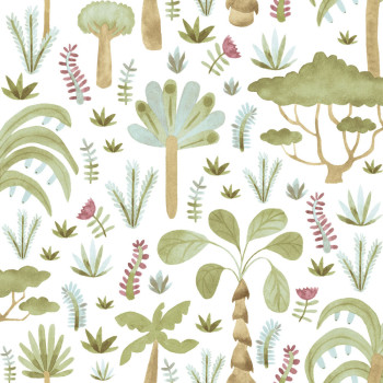 Vliestapete für Kinderzimmer, tropische Pflanzen, weißer Hintergrund, Pflanzen in Grün, Blau, Braun und Violett.