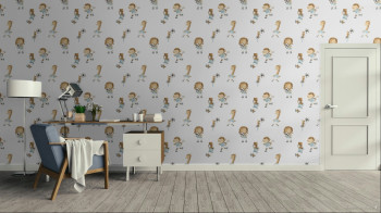Verspielte Vliestapete für Kinderzimmer, weißer Hintergrund, Tiermotive in Gold-, Beige- und Brauntönen, schwarz-weiße Bälle.